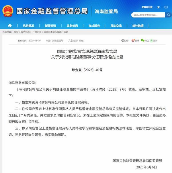 中国网财经5月9日讯今日,国家金融监督管理总局海南监管局公布相关批复信息,核准刘锐海马财务有限公司(简称“海马财务”)董事长的任职资格。以下是相关批复正文:
